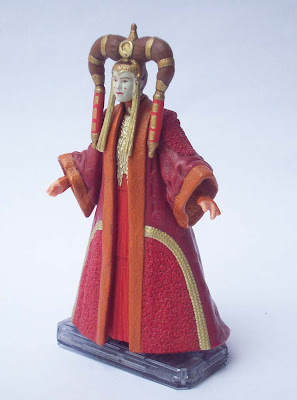 En esta ocasión este traje es el que usa la reina una vez que llega a Coruscant a presentar su reclamo ante el congreso de por el bloqueo contra su pequeño planeta natal Naboo por parte de la federación de comercio, la reina sale alucinantemente vestida y con pintura fácil lo que definitivamente la saca de este mundo y hace aun mas exótico el traje de Amidala, aunque cuando da su discurso ante el congreso galáctico sale con una especie de sobre todo negro encima de todo ese traje, ¿la siguiente versión de este muñeco será con ese accesorio negro para ponérselo encima?, sería muy paja.